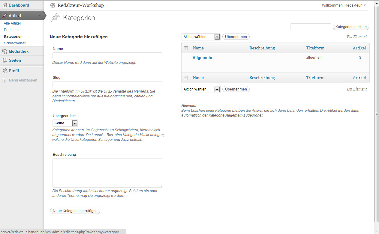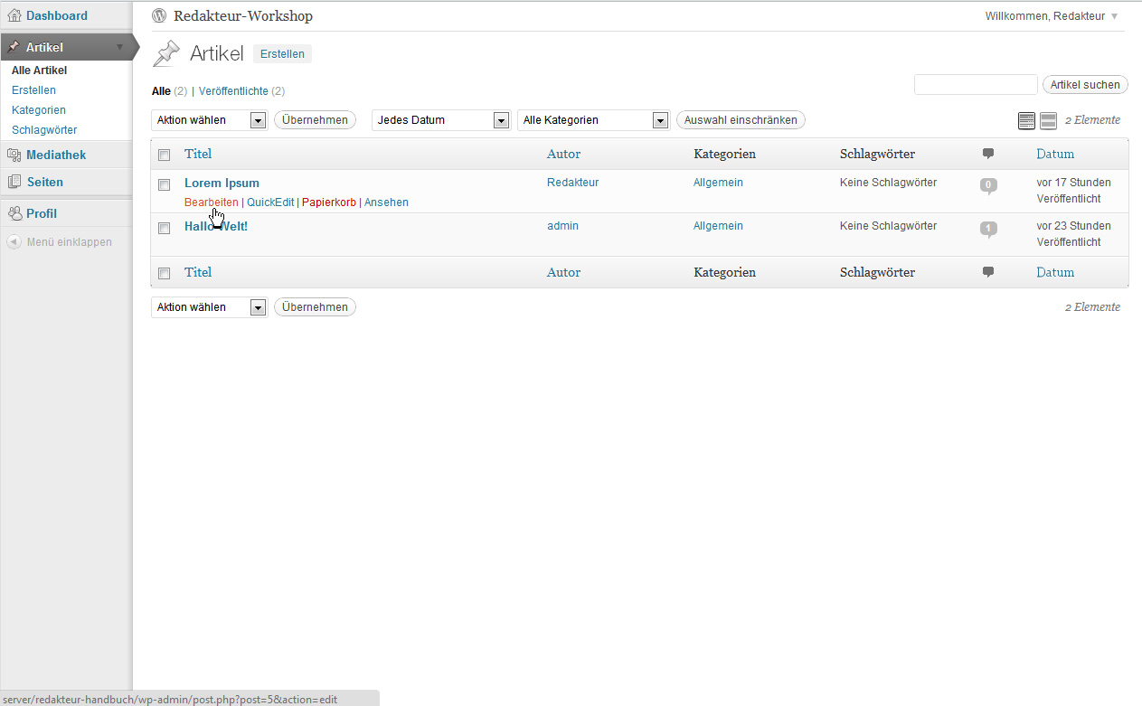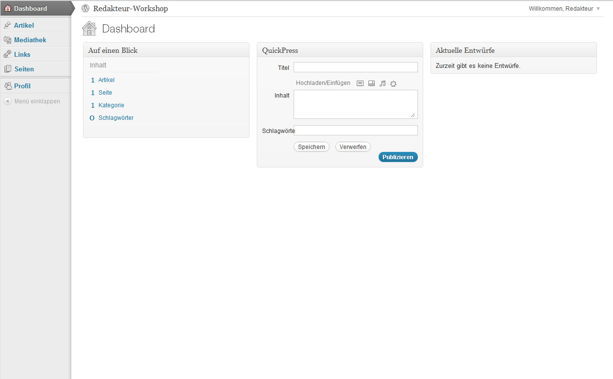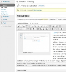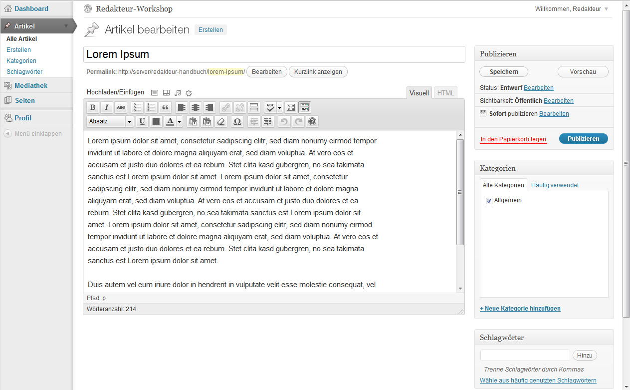 - Erstellen Sie einen ersten Artikel und experimentieren Sie dabei ruhig mit den unterschiedlichen Textformatierungen.