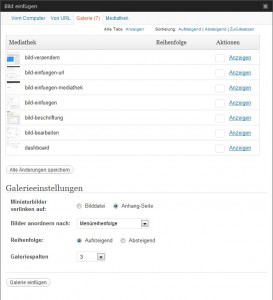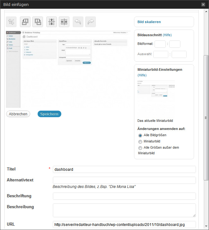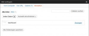 Das Einfügen von Medien erfolgt mit dem Button Medien einbetten/bearbeiten (Nr. 8 in der unteren Leiste). Setzen Sie am besten den Cursor an die Stelle im Text, an der Sie das Medium einfügen möchten und klicken Sie dann auf den Button mit der Filmrolle.